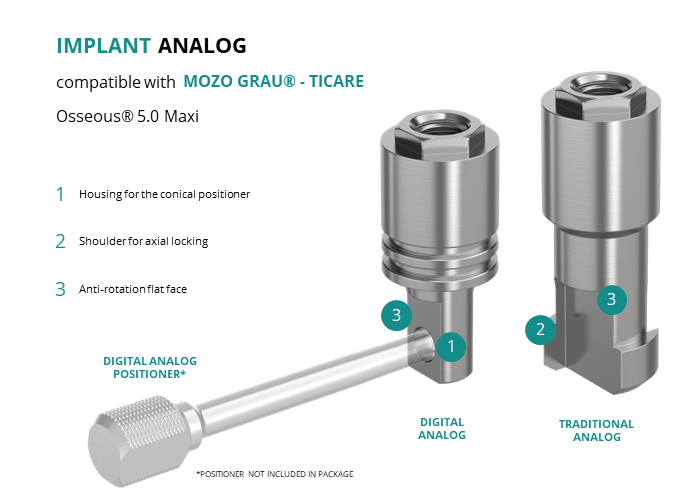 The GT-Medical analog compatible with the Mozo Grau® - Ticare Osseous® 5.0 Maxi implant line is made of Stainless Steel, has a diameter of 5.1mm, and accurately replicates the connection of this Mozo Grau® - Ticare implant.