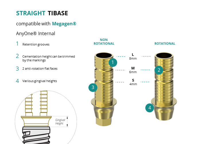 GT-Medical's Ti-Base are compatible with AnyOne® Internal implants from Megagen®, allowing a stable and long-lasting connection between the implant and the prosthesis. They are made entirely of Titanium Grade 5 with a yellow anodized for a more aesthetic finish. They have a cementation trunk that can be cut to various heights, 2 flat faces to perform the anti-rotating function and a gingival body of various heights, depending on the type of connection.