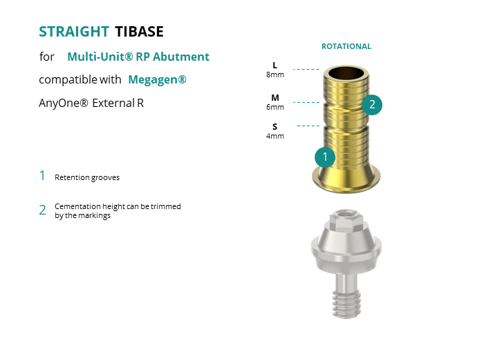 GT-Medical's Ti-Base are compatible with AnyOne® External R implants from Megagen®, allowing a stable and long-lasting connection between the Multi-Unit® RP Abutment and the prosthesis. They are made entirely of Titanium Grade 5 with a yellow anodized for a more aesthetic finish. They have a grooved cementation trunk that can be cut to various heights.