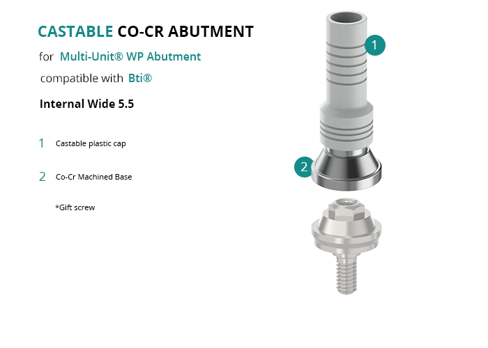 Castable Abutment with Co-Cr Base for Multi-Unit® WP Abutment compatible with Bti® Internal Wide 5.5
