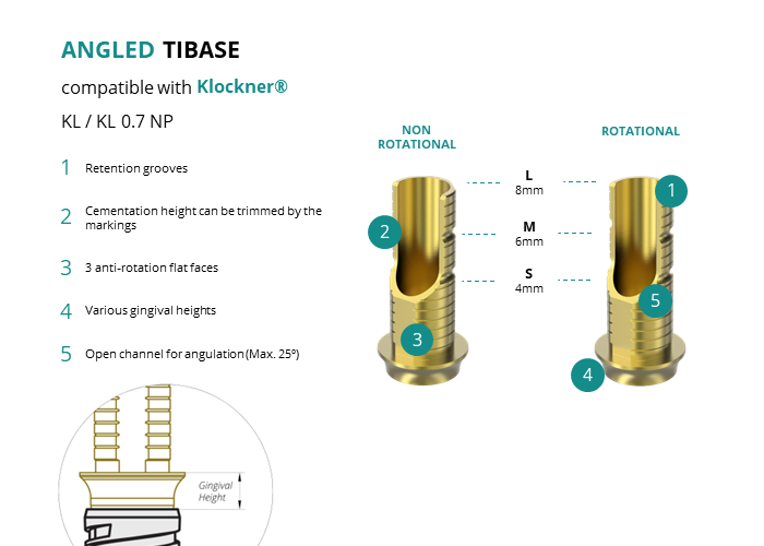 GT-Medical's Angled Ti-Base are compatible with KL / KL 0.7 NP implants from Klockner®, ensuring a stable and long-lasting connection between the implant and the prosthesis, while also allowing angulations to be corrected up to 25 degrees. They are made entirely of Titanium Grade 5 with a yellow anodizing for a more aesthetic finish. They have a cementation trunk that can be cut to various heights with an open channel to allow angulation, 3 flat faces to perform the anti-rotating function and a gingival body of various heights, depending on the type of connection.