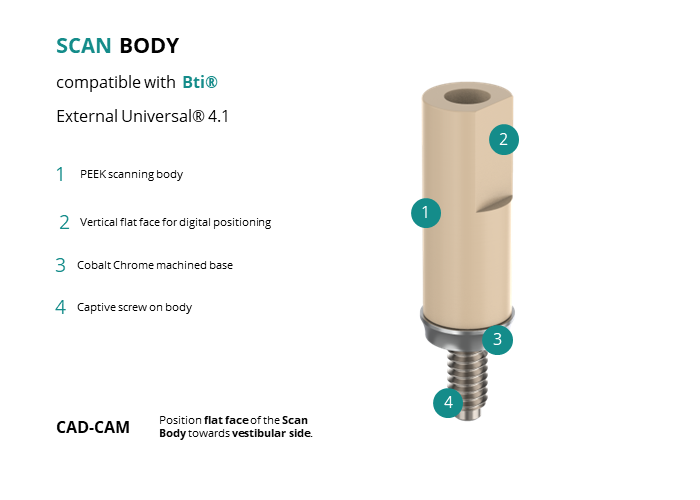 - CAD-CAM: Position flat face of the Scan Body towards vestibular side.