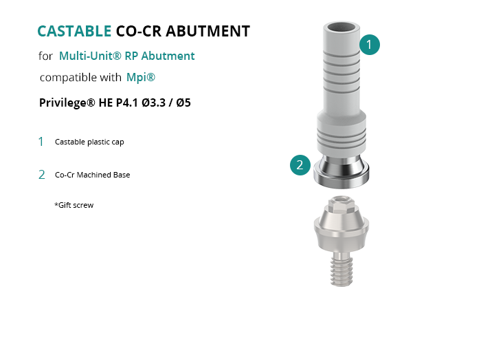 Castable Abutment with Co-Cr Base for Multi-Unit® RP Abutment compatible with Mpi® Privilege® HE P4.1 Ø3.3 / Ø5