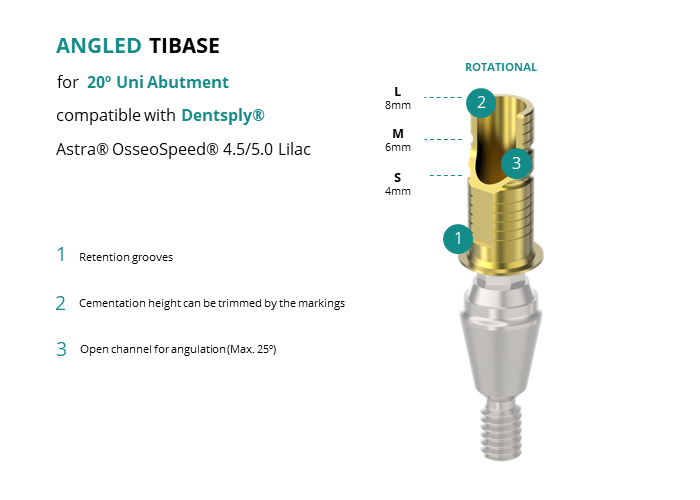 GT-Medical's Angled Ti-Base are compatible with Astra® OsseoSpeed® 4.5/5.0 Lilac implants from Dentsply®, ensuring a stable and long-lasting connection between the 20º Uni Abutment and the prosthesis, while also allowing angulations to be corrected up to 25 degrees. They are made entirely of Titanium Grade 5 with a yellow anodizing for a more aesthetic finish. They have a grooved cementation trunk that can be cut to various heights.