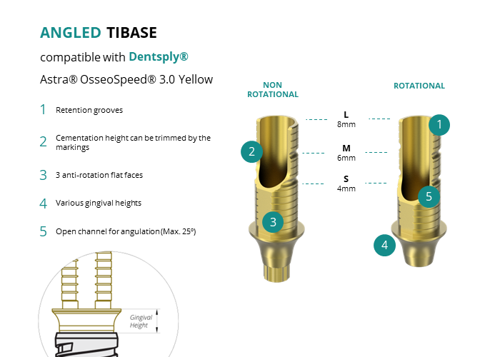 GT-Medical's Angled Ti-Base are compatible with Astra® OsseoSpeed® 3.0 Yellow implants from Dentsply®, ensuring a stable and long-lasting connection between the implant and the prosthesis, while also allowing angulations to be corrected up to 25 degrees. They are made entirely of Titanium Grade 5 with a yellow anodizing for a more aesthetic finish. They have a cementation trunk that can be cut to various heights with an open channel to allow angulation, 3 flat faces to perform the anti-rotating function and a gingival body of various heights, depending on the type of connection.