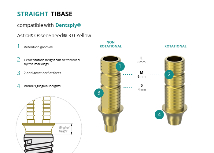 GT-Medical's Ti-Base are compatible with Astra® OsseoSpeed® 3.0 Yellow implants from Dentsply®, allowing a stable and long-lasting connection between the implant and the prosthesis. They are made entirely of Titanium Grade 5 with a yellow anodized for a more aesthetic finish. They have a cementation trunk that can be cut to various heights, 2 flat faces to perform the anti-rotating function and a gingival body of various heights, depending on the type of connection.