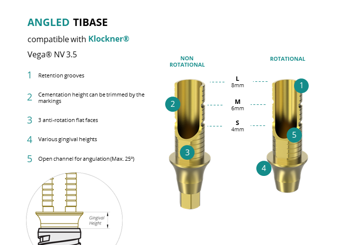 GT-Medical's Angled Ti-Base are compatible with Vega® NV 3.5 implants from Klockner®, ensuring a stable and long-lasting connection between the implant and the prosthesis, while also allowing angulations to be corrected up to 25 degrees. They are made entirely of Titanium Grade 5 with a yellow anodizing for a more aesthetic finish. They have a cementation trunk that can be cut to various heights with an open channel to allow angulation, 3 flat faces to perform the anti-rotating function and a gingival body of various heights, depending on the type of connection.