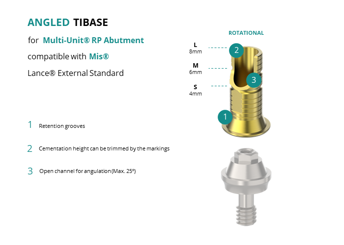 GT-Medical's Angled Ti-Base are compatible with Lance® External Standard implants from Mis®, ensuring a stable and long-lasting connection between the Multi-Unit® RP Abutment and the prosthesis, while also allowing angulations to be corrected up to 25 degrees. They are made entirely of Titanium Grade 5 with a yellow anodizing for a more aesthetic finish. They have a grooved cementation trunk that can be cut to various heights.