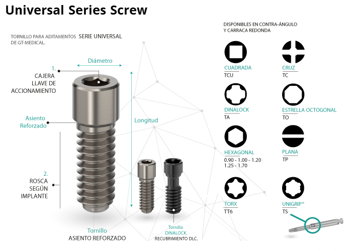 The connection surface of the Universal Series Screw with the abutment has been rigorously designed with a reinforced seat to increase its fatigue resistance. The screwdriver slot may have different shapes depending on the implant system where the screws are housed.