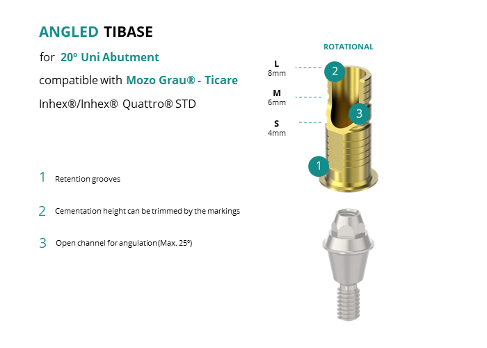 GT-Medical's Angled Ti-Base are compatible with Inhex®/Inhex® Quattro® STD implants from Mozo Grau® - Ticare, ensuring a stable and long-lasting connection between the 20º Uni Abutment and the prosthesis, while also allowing angulations to be corrected up to 25 degrees. They are made entirely of Titanium Grade 5 with a yellow anodizing for a more aesthetic finish. They have a grooved cementation trunk that can be cut to various heights.