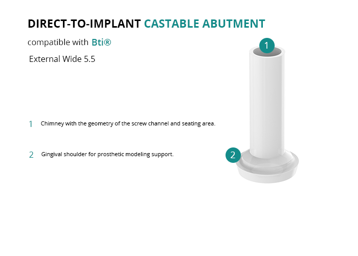 The direct-to-implant castable is ideal for creating customized abutments and screw-retained frameworks, ensuring a reliable and high-quality fit for restorations on implants with the External Wide 5.5 platform from Bti®.