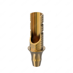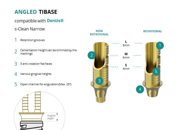 GT-Medical's Angled Ti-Base are compatible with s-Clean Narrow implants from Dentis®, ensuring a stable and long-lasting connection between the implant and the prosthesis, while also allowing angulations to be corrected up to 25 degrees. They are made entirely of Titanium Grade 5 with a yellow anodizing for a more aesthetic finish. They have a cementation trunk that can be cut to various heights with an open channel to allow angulation, 3 flat faces to perform the anti-rotating function and a gingival body of various heights, depending on the type of connection.