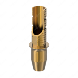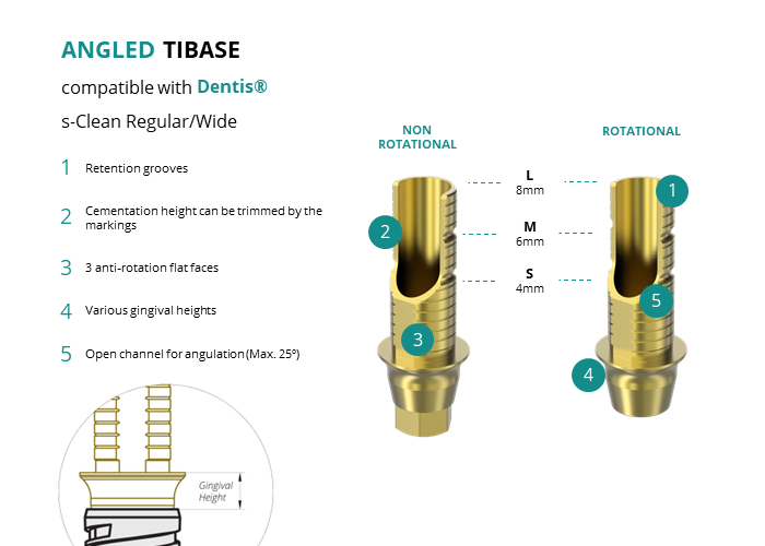 GT-Medical's Angled Ti-Base are compatible with s-Clean Regular/Wide implants from Dentis®, ensuring a stable and long-lasting connection between the implant and the prosthesis, while also allowing angulations to be corrected up to 25 degrees. They are made entirely of Titanium Grade 5 with a yellow anodizing for a more aesthetic finish. They have a cementation trunk that can be cut to various heights with an open channel to allow angulation, 3 flat faces to perform the anti-rotating function and a gingival body of various heights, depending on the type of connection.
