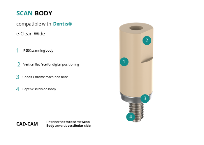 - CAD-CAM: Position flat face of the Scan Body towards vestibular side.