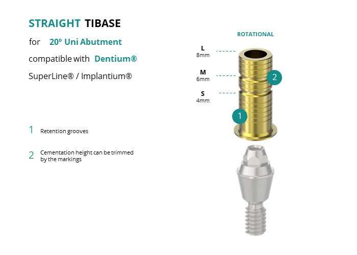 GT-Medical's Ti-Base are compatible with SuperLine® / Implantium® implants from Dentium®, allowing a stable and long-lasting connection between the 20º Uni Abutment and the prosthesis. They are made entirely of Titanium Grade 5 with a yellow anodized for a more aesthetic finish. They have a grooved cementation trunk that can be cut to various heights.
