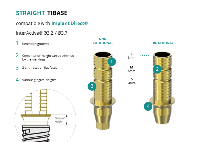 GT-Medical's Ti-Base are compatible with InterActive® Ø3.2 / Ø3.7 implants from Implant Direct®, allowing a stable and long-lasting connection between the implant and the prosthesis. They are made entirely of Titanium Grade 5 with a yellow anodized for a more aesthetic finish. They have a cementation trunk that can be cut to various heights, 2 flat faces to perform the anti-rotating function and a gingival body of various heights, depending on the type of connection.