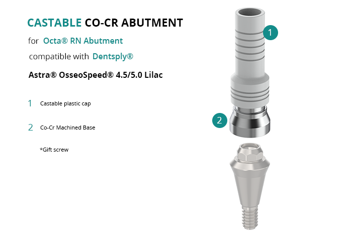 GT-Medical's castable Co-Cr abutment is compatible with Astra® OsseoSpeed® 4.5/5.0 Lilac implants from Dentsply®, ensuring a solid base for the prosthetic structure and guaranteeing an optimal fit with the Octa® RN Abutment. It is made up of a machined Cobalt Chrome base and a castable plastic cap.