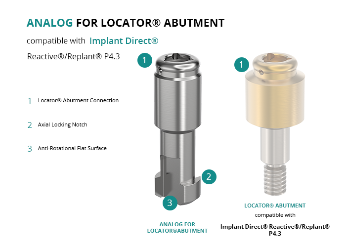 The analog for Locator® Abutment is essential for creating the model of a removable overdenture restoration that uses Locator® abutments on implants, such as those from Implant Direct® with the Reactive®/Replant® P4.3 platform.