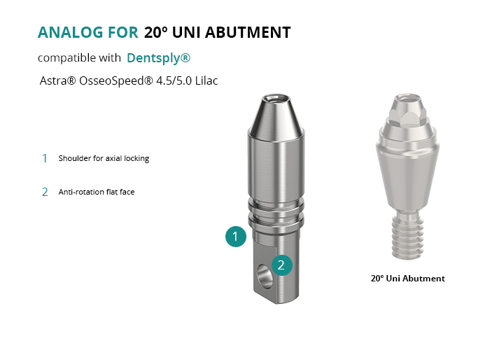 The analog is an essential tool for reproducing the functional geometry of the 20º Uni Abutment, facilitating the fabrication of both traditional and digital restorations. It is compatible with Dentsply® implants with Astra® OsseoSpeed® 4.5/5.0 Lilac platform, ensuring optimal results in prosthetic restorations over implants.