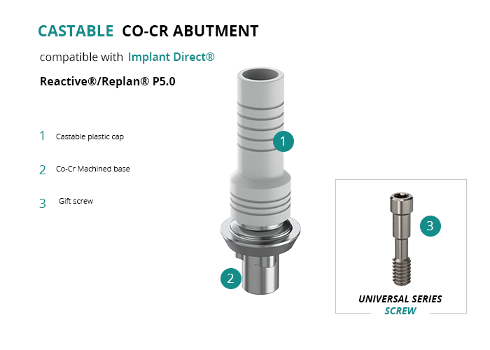 Castable Abutment with Co-Cr Base compatible with Implant Direct® Reactive®/Replan® P5.0