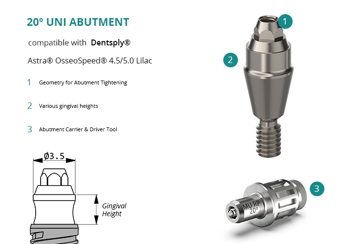 The 20º Uni Abutment from GT-Medical is compatible with Astra® OsseoSpeed® 4.5/5.0 Lilac from Dentsply®, providing a durable and stable connection for multiple restorations. Manufactured from Grade 5 Titanium has a diameter of 3.5mm, it guarantees high strength, biocompatibility, and durability in implant-supported restorations. Its design includes various gingival heights, facilitating adaptation to different soft tissue profiles and ensuring optimal aesthetics.