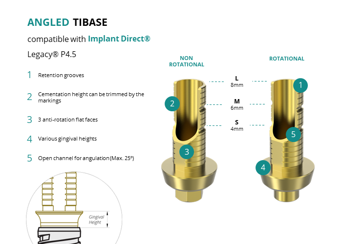 GT-Medical's Angled Ti-Base are compatible with Legacy® P4.5 implants from Implant Direct®, ensuring a stable and long-lasting connection between the implant and the prosthesis, while also allowing angulations to be corrected up to 25 degrees. They are made entirely of Titanium Grade 5 with a yellow anodizing for a more aesthetic finish. They have a cementation trunk that can be cut to various heights with an open channel to allow angulation, 3 flat faces to perform the anti-rotating function and a gingival body of various heights, depending on the type of connection.