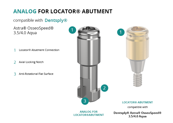 The analog for Locator® Abutment is essential for creating the model of a removable overdenture restoration that uses Locator® abutments on implants, such as those from Dentsply® with the Astra® OsseoSpeed® 3.5/4.0 Aqua platform.