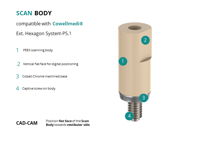 - CAD-CAM: Position flat face of the Scan Body towards vestibular side.