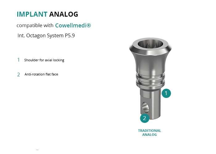 The GT-Medical analog compatible with the Cowellmedi® Int. Octagon System P5.9 implant line is made of Stainless Steel, has a diameter of 5.9mm, and accurately replicates the connection of this Cowellmedi® implant.