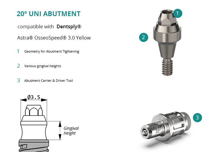 20º Uni Abutment compatible with Dentsply® Astra® OsseoSpeed® 3.0 Yellow