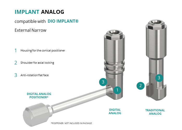 The GT-Medical analog compatible with the Dio Implant® External Narrow implant line is made of Stainless Steel, has a diameter of 3.5mm, and accurately replicates the connection of this Dio Implant® implant.