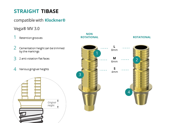 GT-Medical's Ti-Base are compatible with Vega® MV 3.0 implants from Klockner®, allowing a stable and long-lasting connection between the implant and the prosthesis. They are made entirely of Titanium Grade 5 with a yellow anodized for a more aesthetic finish. They have a cementation trunk that can be cut to various heights, 2 flat faces to perform the anti-rotating function and a gingival body of various heights, depending on the type of connection.