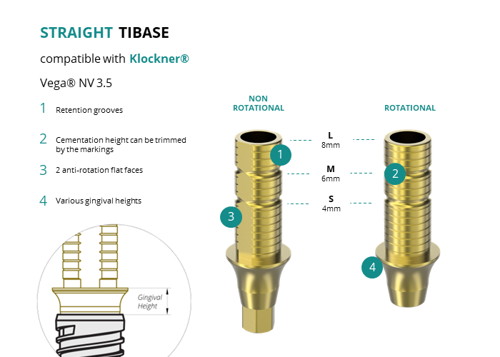 GT-Medical's Ti-Base are compatible with Vega® NV 3.5 implants from Klockner®, allowing a stable and long-lasting connection between the implant and the prosthesis. They are made entirely of Titanium Grade 5 with a yellow anodized for a more aesthetic finish. They have a cementation trunk that can be cut to various heights, 2 flat faces to perform the anti-rotating function and a gingival body of various heights, depending on the type of connection.