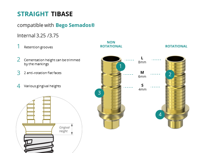 GT-Medical's Ti-Base are compatible with Internal 3.25 /3.75 implants from Bego Semados®, allowing a stable and long-lasting connection between the implant and the prosthesis. They are made entirely of Titanium Grade 5 with a yellow anodized for a more aesthetic finish. They have a cementation trunk that can be cut to various heights, 2 flat faces to perform the anti-rotating function and a gingival body of various heights, depending on the type of connection.