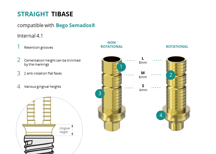 GT-Medical's Ti-Base are compatible with Internal 4.1 implants from Bego Semados®, allowing a stable and long-lasting connection between the implant and the prosthesis. They are made entirely of Titanium Grade 5 with a yellow anodized for a more aesthetic finish. They have a cementation trunk that can be cut to various heights, 2 flat faces to perform the anti-rotating function and a gingival body of various heights, depending on the type of connection.