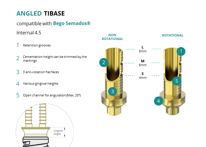 GT-Medical's Angled Ti-Base are compatible with Internal 4.5 implants from Bego Semados®, ensuring a stable and long-lasting connection between the implant and the prosthesis, while also allowing angulations to be corrected up to 25 degrees. They are made entirely of Titanium Grade 5 with a yellow anodizing for a more aesthetic finish. They have a cementation trunk that can be cut to various heights with an open channel to allow angulation, 3 flat faces to perform the anti-rotating function and a gingival body of various heights, depending on the type of connection.