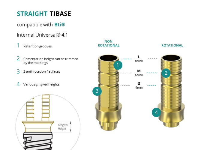 GT-Medical's Ti-Base are compatible with Internal Universal® 4.1 implants from Bti®, allowing a stable and long-lasting connection between the implant and the prosthesis. They are made entirely of Titanium Grade 5 with a yellow anodized for a more aesthetic finish. They have a cementation trunk that can be cut to various heights, 2 flat faces to perform the anti-rotating function and a gingival body of various heights, depending on the type of connection.