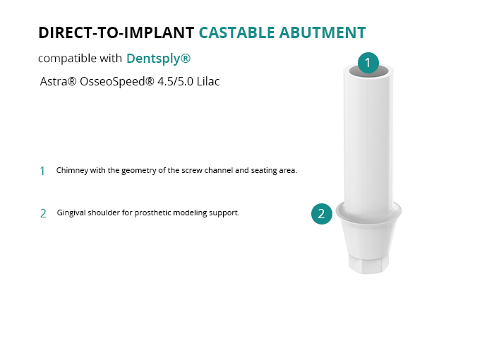 The direct-to-implant castable is ideal for creating customized abutments and screw-retained frameworks, ensuring a reliable and high-quality fit for restorations on implants with the Astra® OsseoSpeed® 4.5/5.0 Lilac platform from Dentsply®.