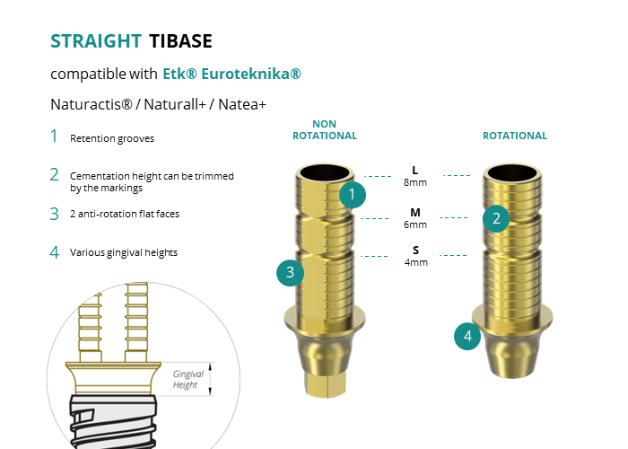 GT-Medical's Ti-Base are compatible with Naturactis® / Naturall+ / Natea+ implants from Etk® Euroteknika®, allowing a stable and long-lasting connection between the implant and the prosthesis. They are made entirely of Titanium Grade 5 with a yellow anodized for a more aesthetic finish. They have a cementation trunk that can be cut to various heights, 2 flat faces to perform the anti-rotating function and a gingival body of various heights, depending on the type of connection.