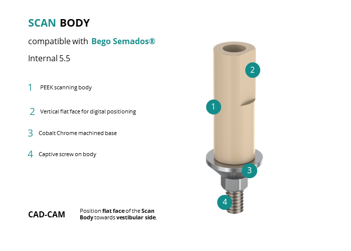 - CAD-CAM: Position flat face of the Scan Body towards vestibular side.