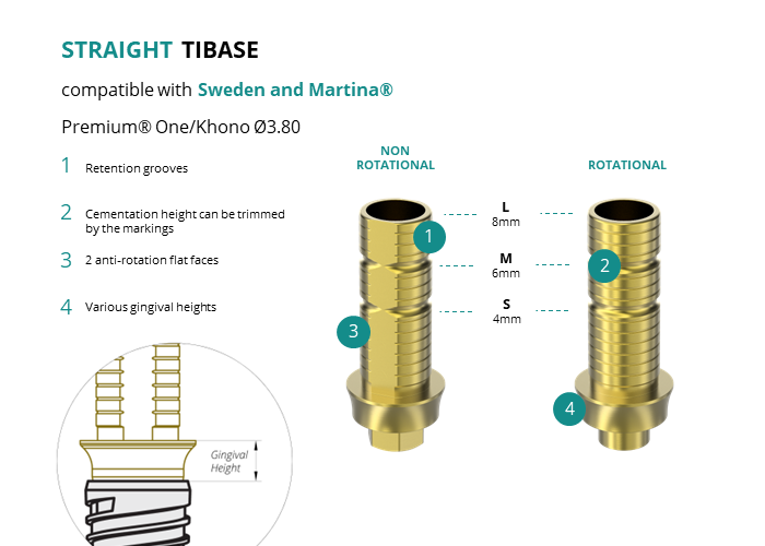 GT-Medical's Ti-Base are compatible with Premium® One/Khono Ø3.80 implants from Sweden and Martina®, allowing a stable and long-lasting connection between the implant and the prosthesis. They are made entirely of Titanium Grade 5 with a yellow anodized for a more aesthetic finish. They have a cementation trunk that can be cut to various heights, 2 flat faces to perform the anti-rotating function and a gingival body of various heights, depending on the type of connection.