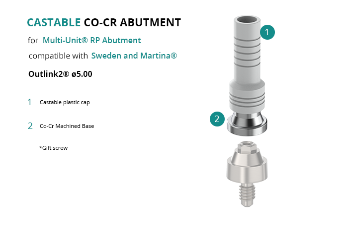 GT-Medical's castable Co-Cr abutment is compatible with Outlink2® Ø5.00 implants from Sweden and Martina®, ensuring a solid base for the prosthetic structure and guaranteeing an optimal fit with the Multi-Unit® RP Abutment. It is made up of a machined Cobalt Chrome base and a castable plastic cap.