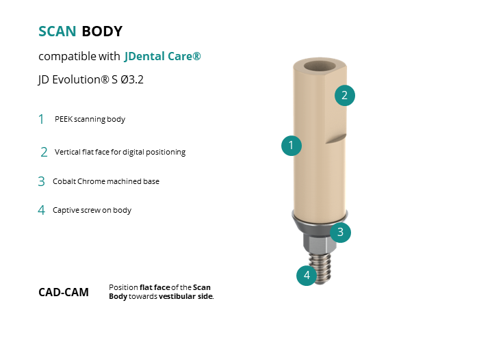 - CAD-CAM: Position flat face of the Scan Body towards vestibular side.