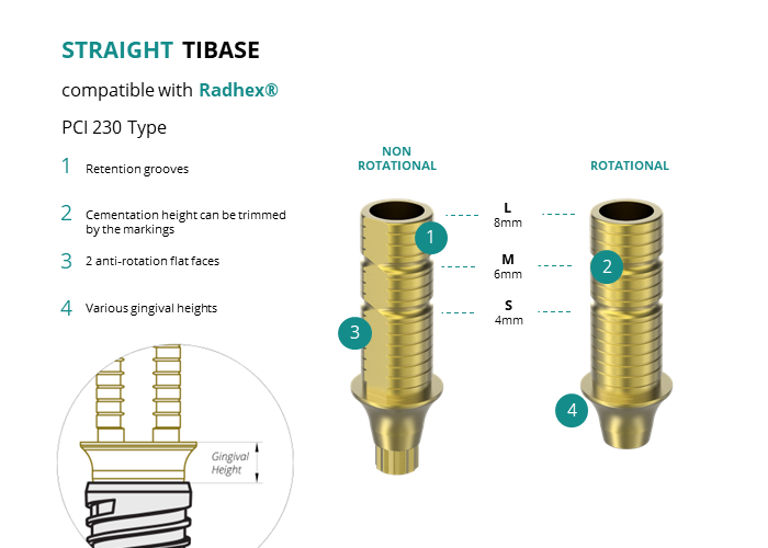 GT-Medical's Ti-Base are compatible with PCI 230 Type implants from Radhex®, allowing a stable and long-lasting connection between the implant and the prosthesis. They are made entirely of Titanium Grade 5 with a yellow anodized for a more aesthetic finish. They have a cementation trunk that can be cut to various heights, 2 flat faces to perform the anti-rotating function and a gingival body of various heights, depending on the type of connection.