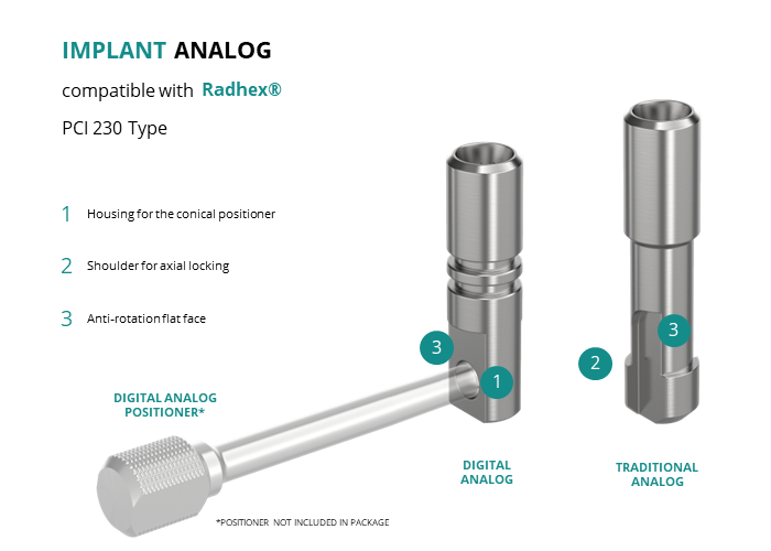 The GT-Medical analog compatible with the Radhex® PCI 230 Type implant line is made of Stainless Steel, has a diameter of 3.0mm, and accurately replicates the connection of this Radhex® implant.