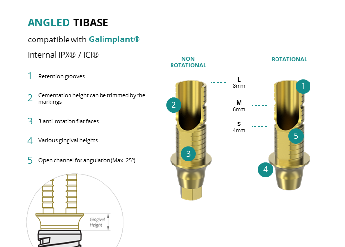 GT-Medical's Angled Ti-Base are compatible with Internal IPX® / ICI® implants from Galimplant®, ensuring a stable and long-lasting connection between the implant and the prosthesis, while also allowing angulations to be corrected up to 25 degrees. They are made entirely of Titanium Grade 5 with a yellow anodizing for a more aesthetic finish. They have a cementation trunk that can be cut to various heights with an open channel to allow angulation, 3 flat faces to perform the anti-rotating function and a gingival body of various heights, depending on the type of connection.