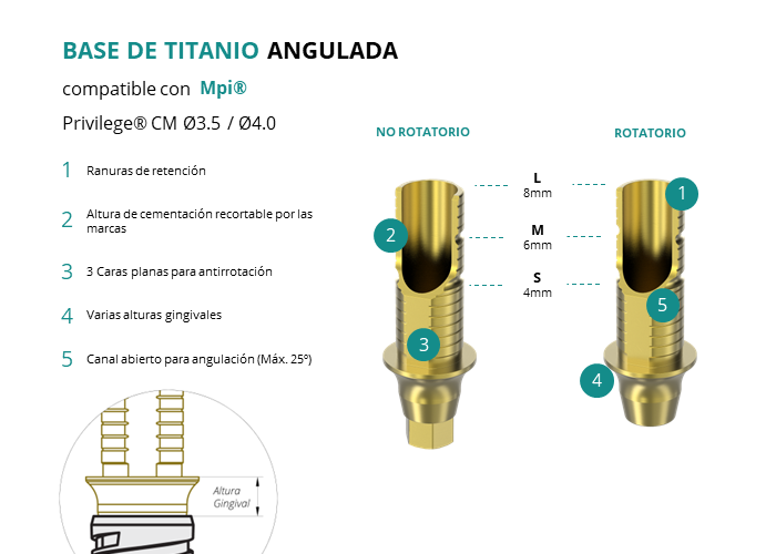 Las Ti-Base Anguladas de GT-Medical son compatibles con los implantes Privilege® CM Ø3.5 / Ø4.0 de Mpi®, facilitando una conexión estable y duradera entre el implante y la prótesis, y permitiendo corregir angulaciones de hasta 25 grados. Están compuestas en su totalidad por Titanio de Grado 5 con un anodizado dorado para un acabado más estético. Poseen un tronco de cementación recortable a varias alturas con canal abierto para permitir angulación, 3 caras planas para realizar la función antirotativa y un cuerpo gingival de varias alturas, dependiendo del tipo de conexión.