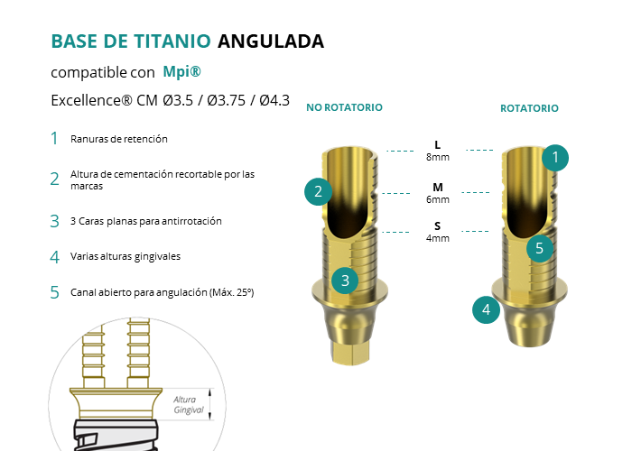Las Ti-Base Anguladas de GT-Medical son compatibles con los implantes Excellence® CM Ø3.5 / Ø3.75 / Ø4.3 de Mpi®, facilitando una conexión estable y duradera entre el implante y la prótesis, y permitiendo corregir angulaciones de hasta 25 grados. Están compuestas en su totalidad por Titanio de Grado 5 con un anodizado dorado para un acabado más estético. Poseen un tronco de cementación recortable a varias alturas con canal abierto para permitir angulación, 3 caras planas para realizar la función antirotativa y un cuerpo gingival de varias alturas, dependiendo del tipo de conexión.