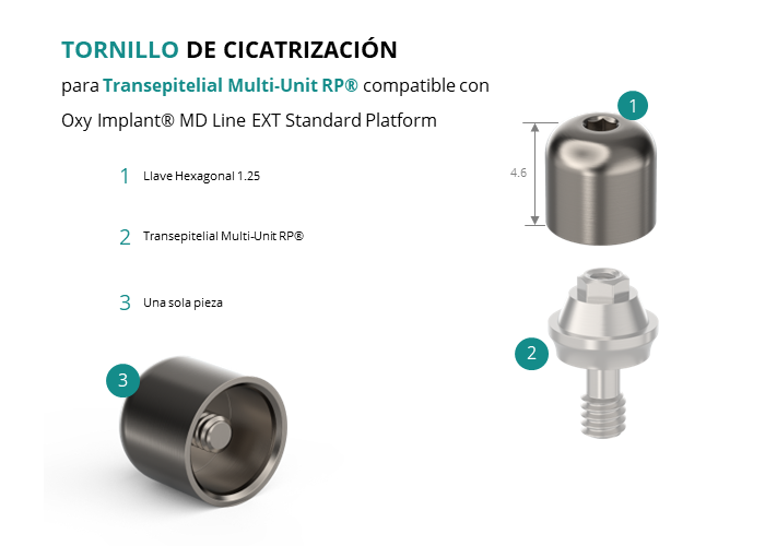 GT-Medical ofrece un Tornillo de Cicatrización para el Transepitelial Multi-Unit® RP (tipo Nobel®) compatible con la línea de implantes MD Line EXT Standard Platform de la marca Oxy Implant®, está fabricado en Titanio Grado 5, tiene un diámetro de 4.8mm, y una altura total de 4.6mm.