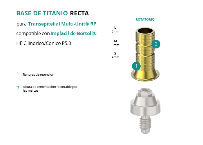 Las Ti-Base Rectas de GT-Medical son compatibles con los implantes HE Cilindrico/Conico P5.0 de Implacil de Bortoli®, permitiendo una conexión estable y duradera entre el Transepitelial Multi-Unit® RP y la prótesis. Están compuestas en su totalidad por Titanio de Grado 5 con un anodizado dorado para un acabado más estético. Poseen un tronco de cementación ranurado y recortable a varias alturas.
